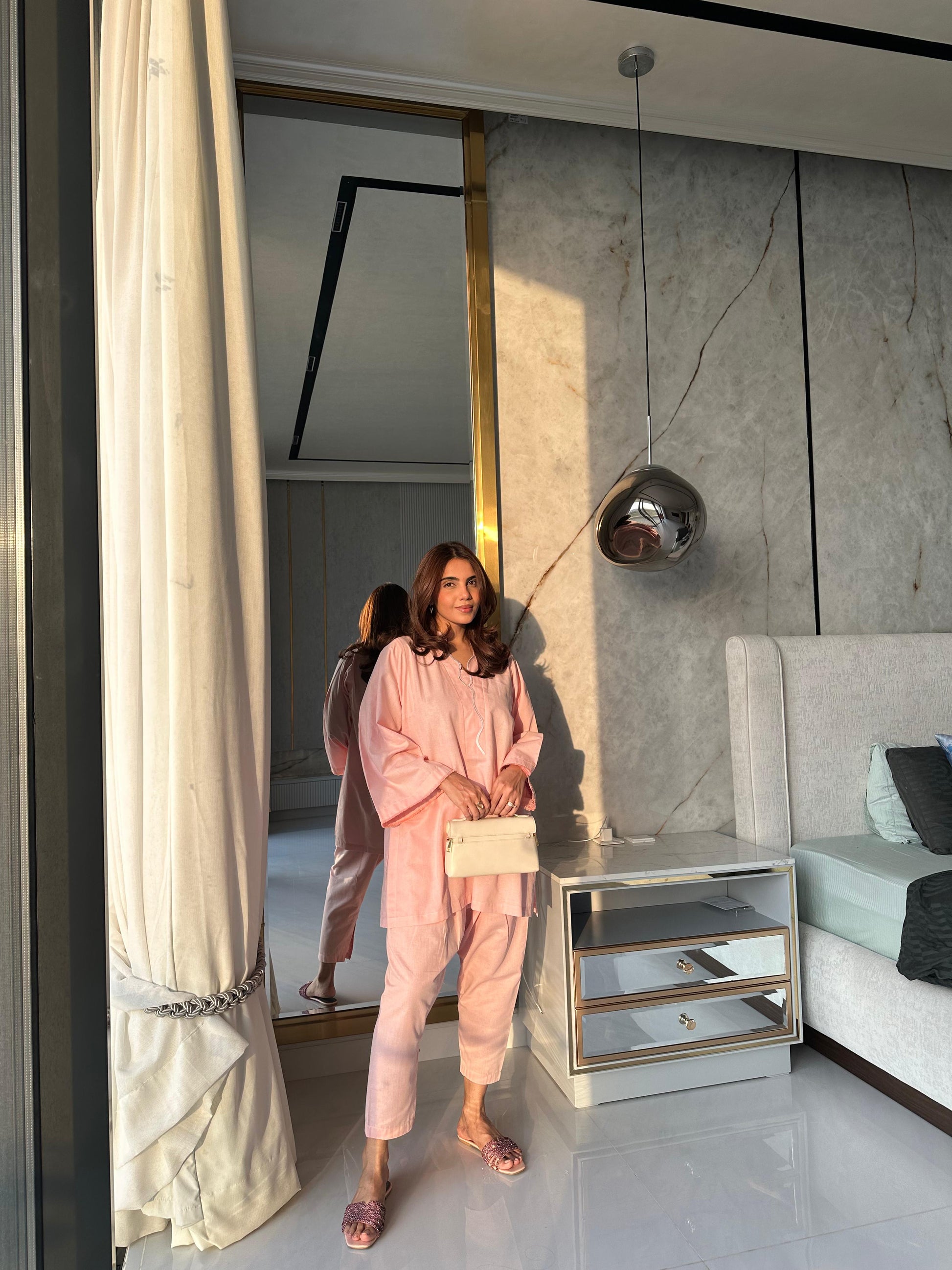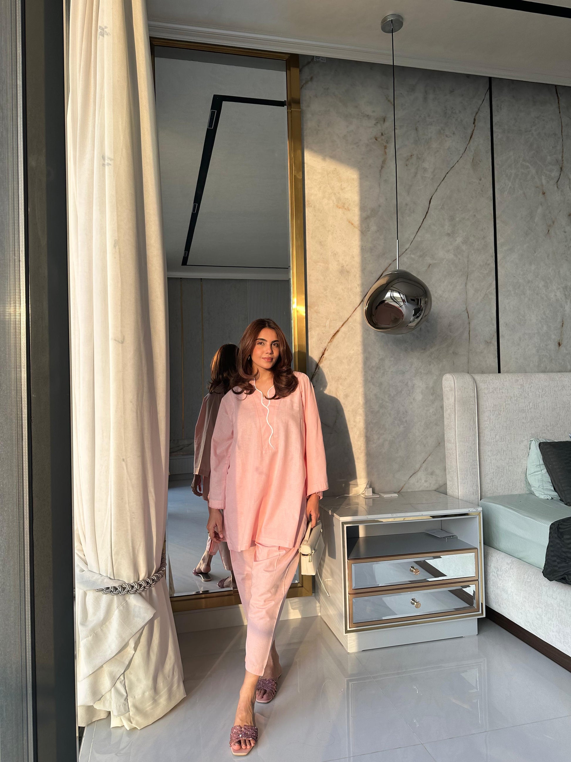 Relaxed, refined, and effortlessly pretty — a blush pink kurta with embroidered details and khari shalwar.