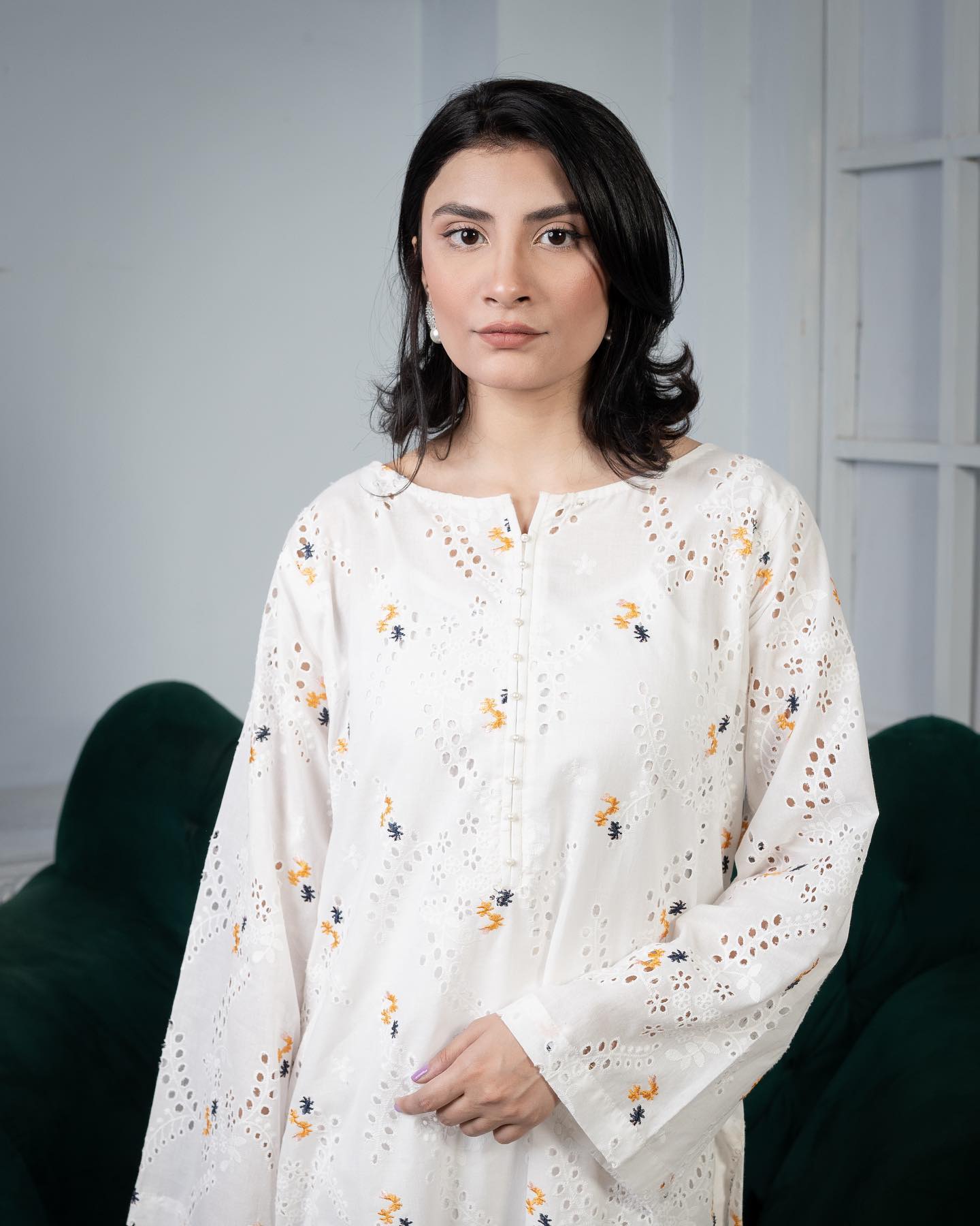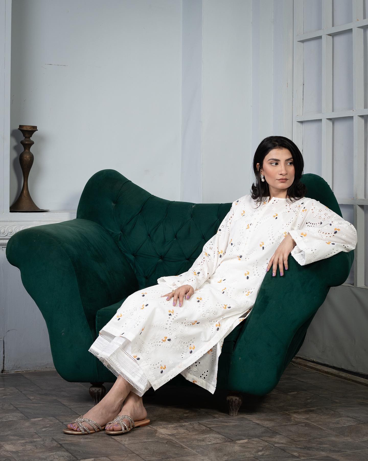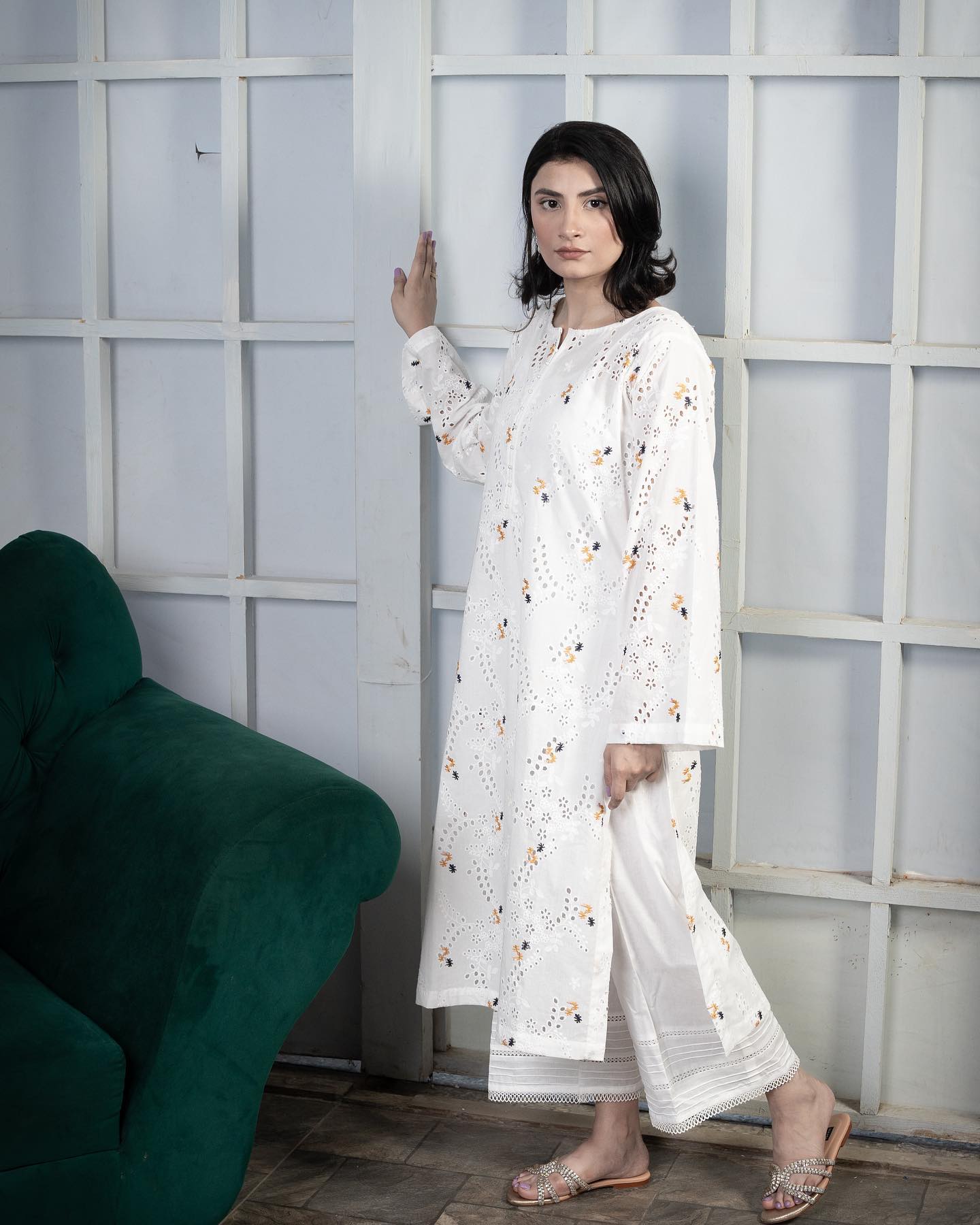 Step out with “lilly” in style with our elegant and sophisticated white kurta, perfect for any occasion.Crafted from the finest quality fabric, this exudes comfort and elegance. The crisp white hue is simply breathtaking, and is accentuated by intricate detailing that makes it stand out from the rest. Whether for an Eid look or dressing up for a casual day out, this white kurra promises to make you feel confident. Add it to your wardrobe and get ready to turn heads wherever you go!