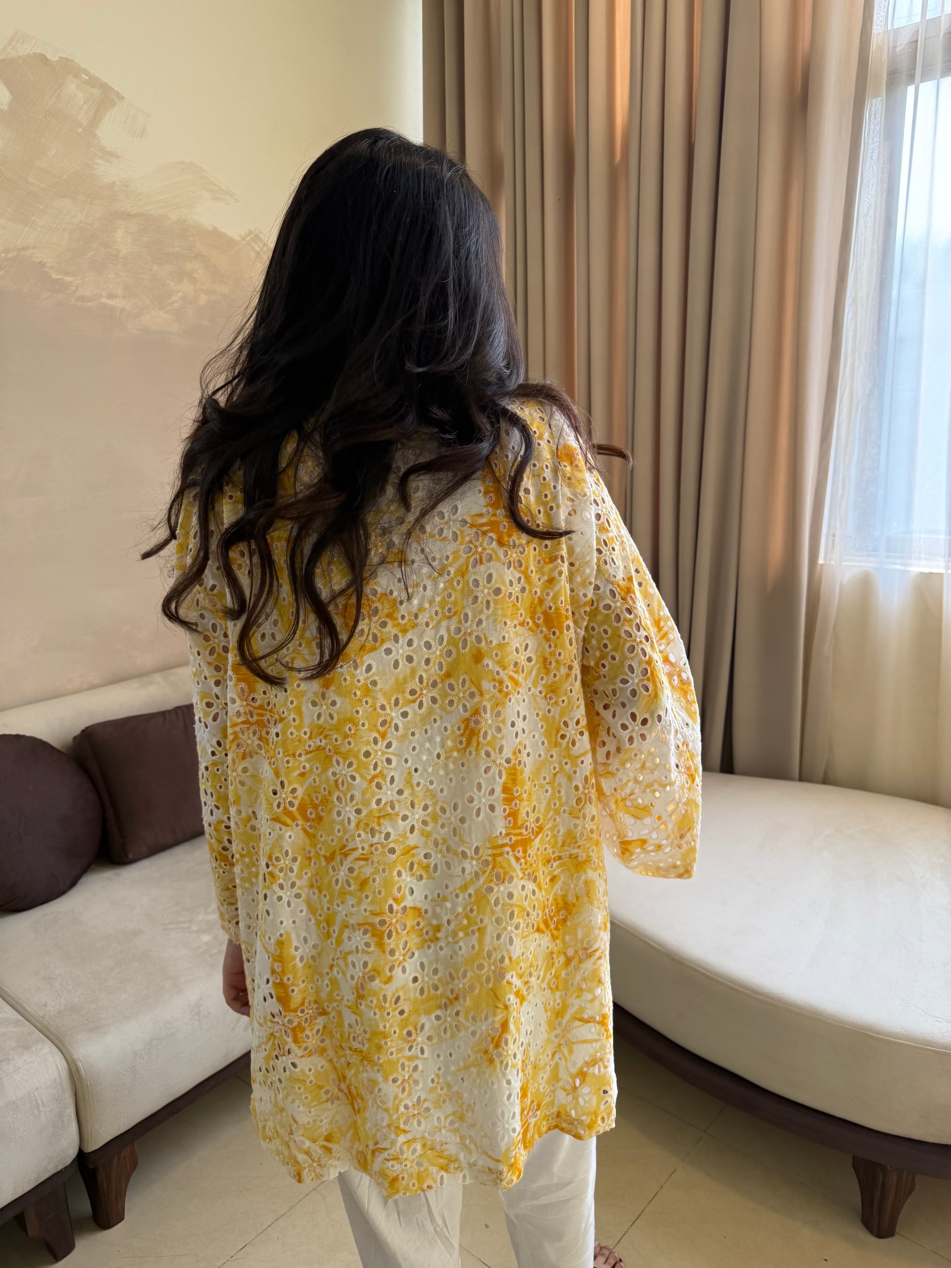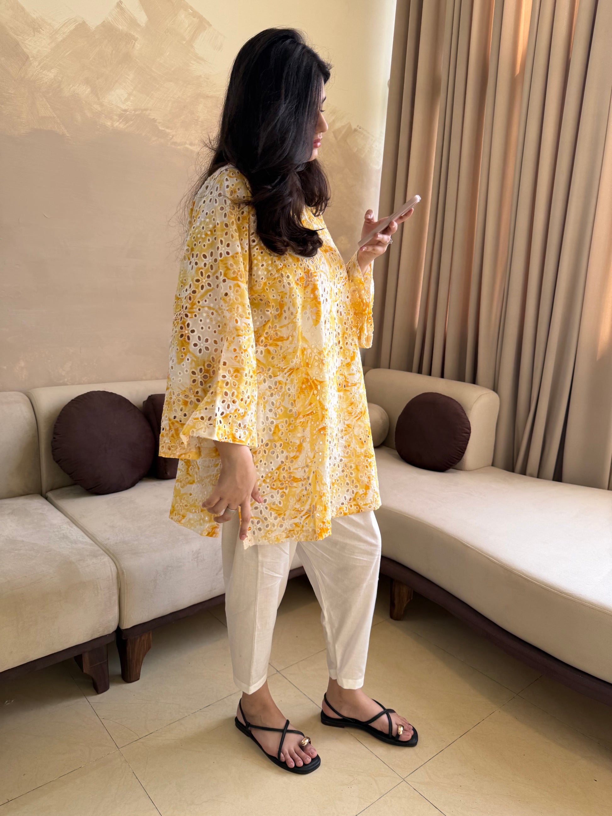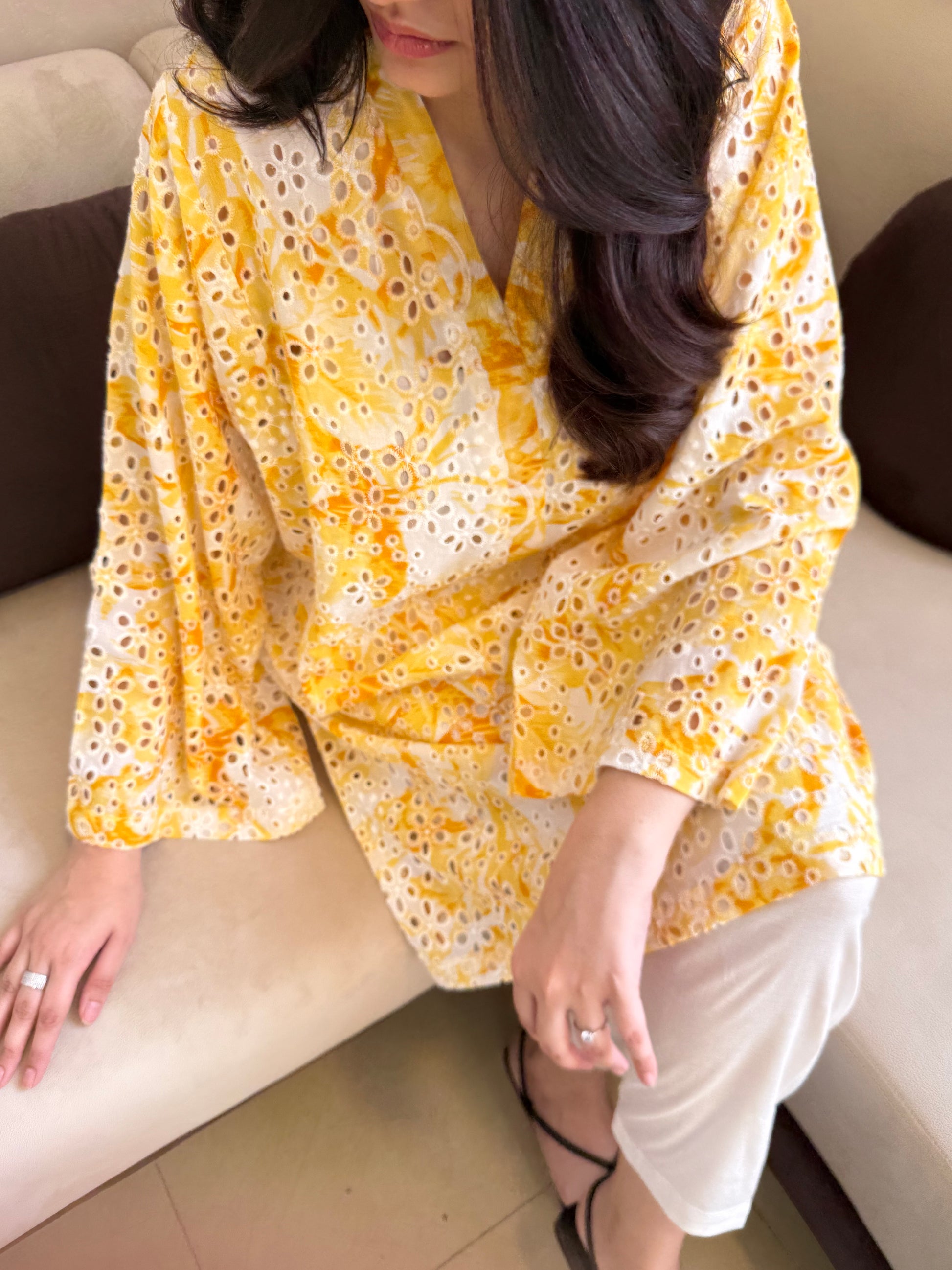 Printed chicken lose-fit shirt paired with signature khari shalwar.