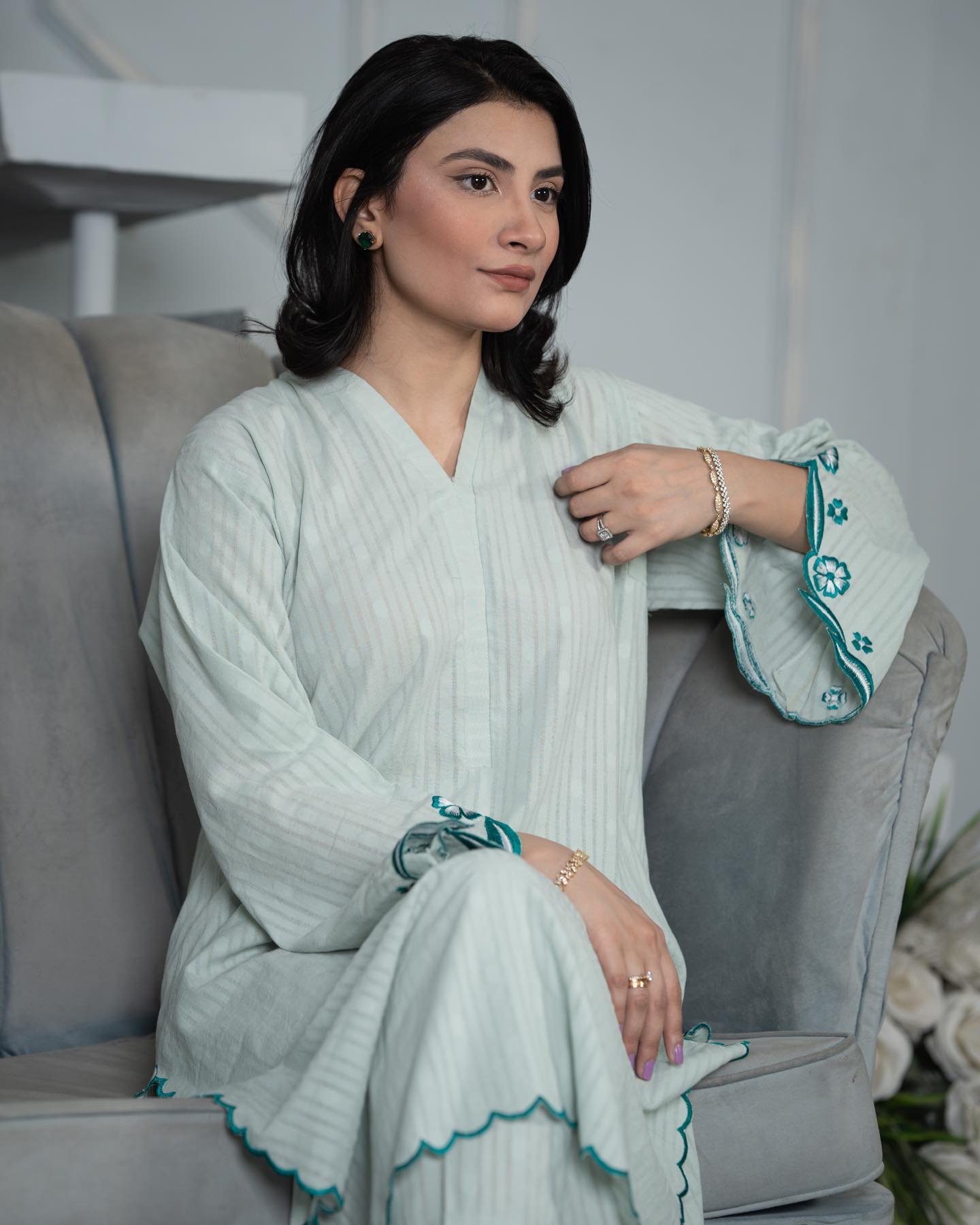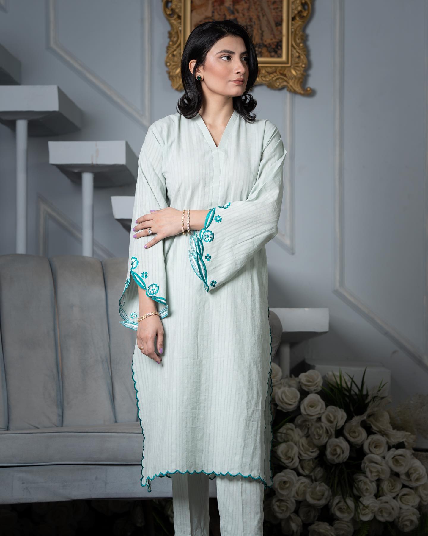 'Seabreeze' is a highlight of our collection. The light green Kurta is perfect for a casual daytime outing or even a semi-formal event. The self-printed fabric adds a touch of elegance and texture to the outfit creating a subtle yet stylish statement. The embroidery on the sleeves and lining adds a pop of color and intricate detail making it stand out among other plain outfits.