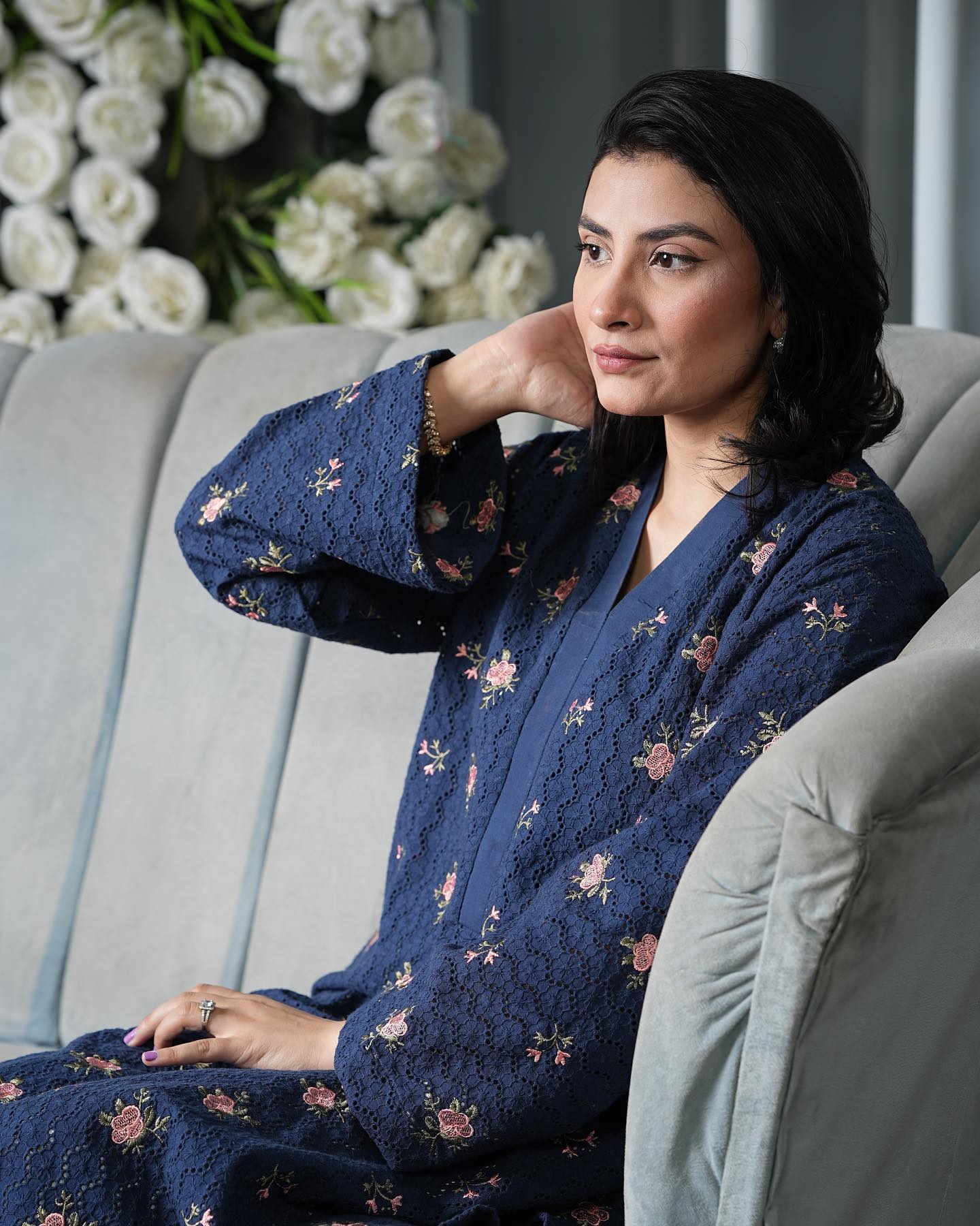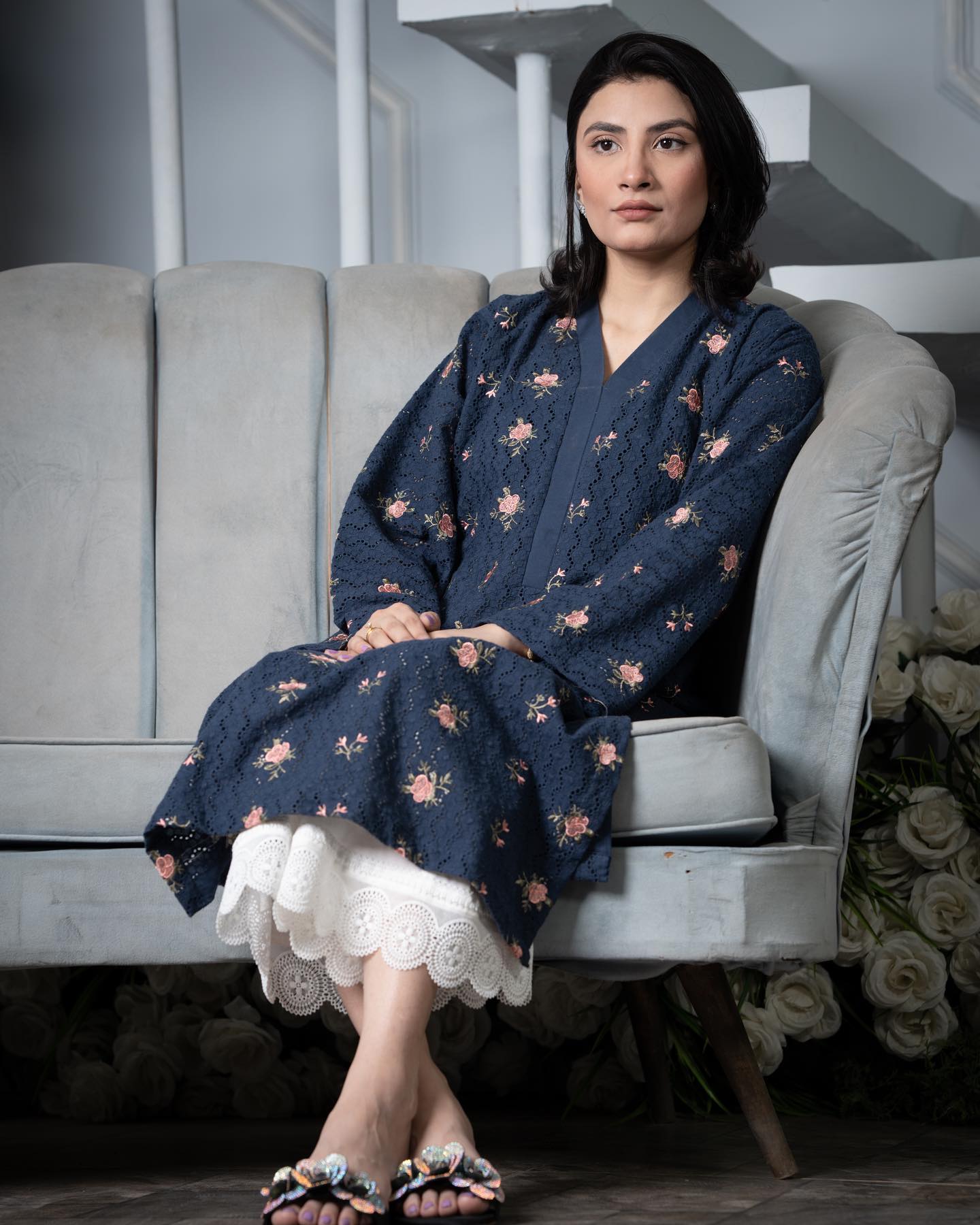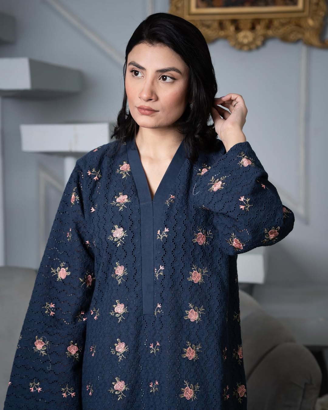 This blue kurta made from the finest quality chicken fabric is a stunning addition to any wardrobe. Featuring a trending shade of blue, this boasts delicate pink floral embroidery that is both feminine and elegant. The intricate embroidery work is scattered over the front, back, and sleeves of the kurta, adding a touch of sophisticated charm to the overall design. The kurta has a comfortable and loose fit which allows freedom of movement, making it ideal for wearing on any occasion.