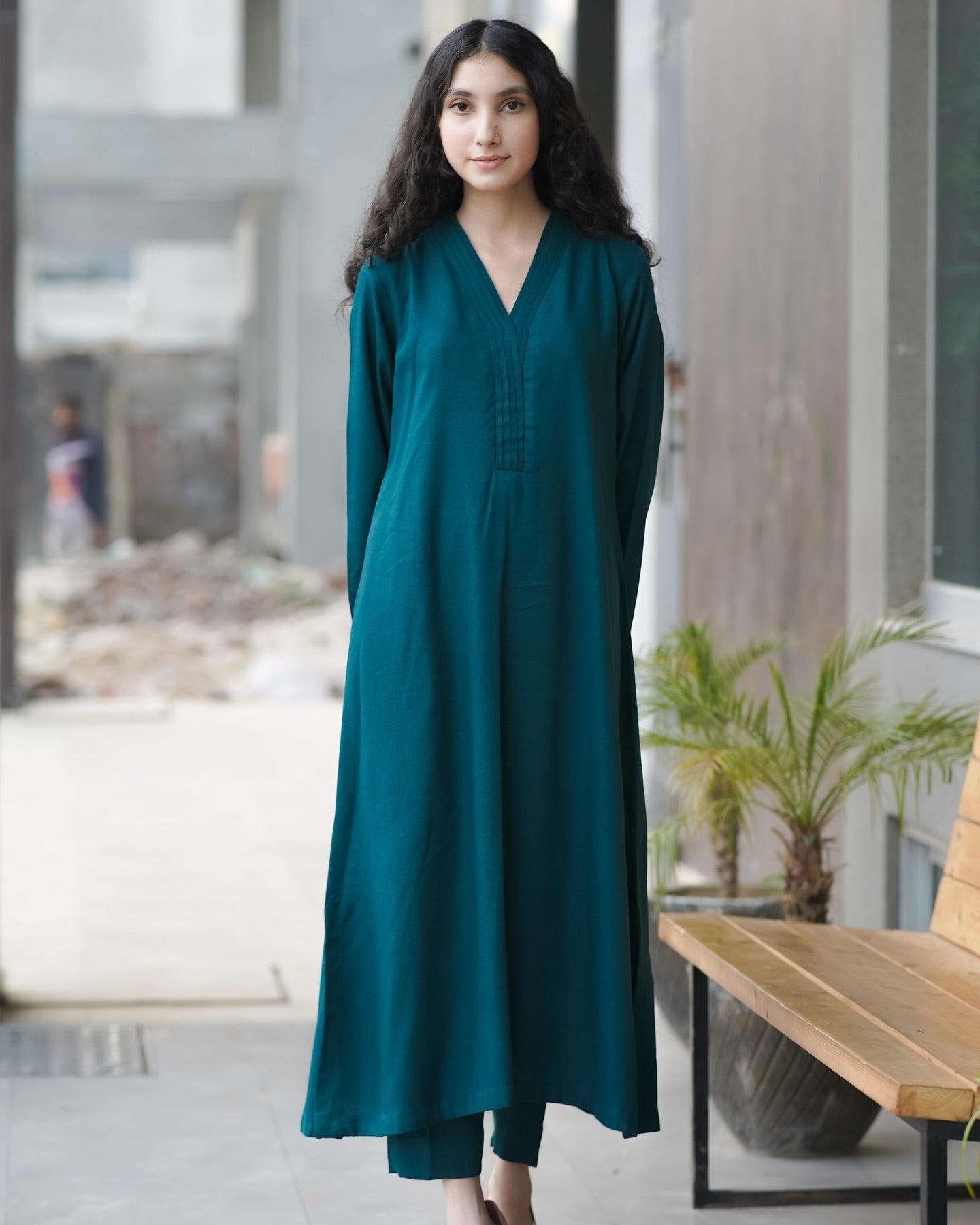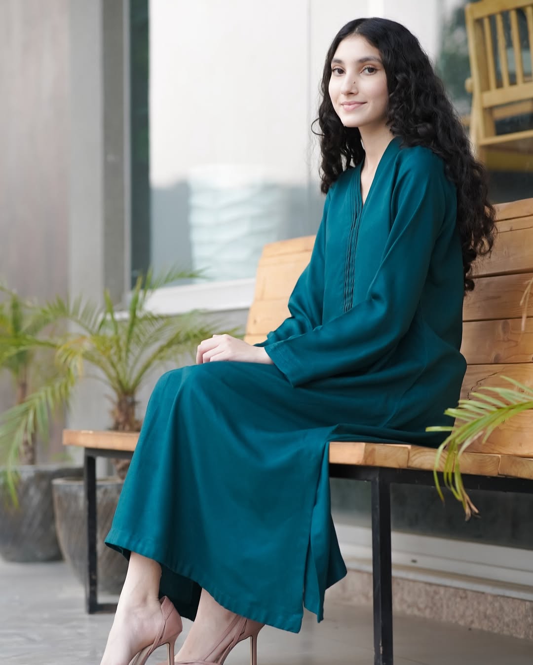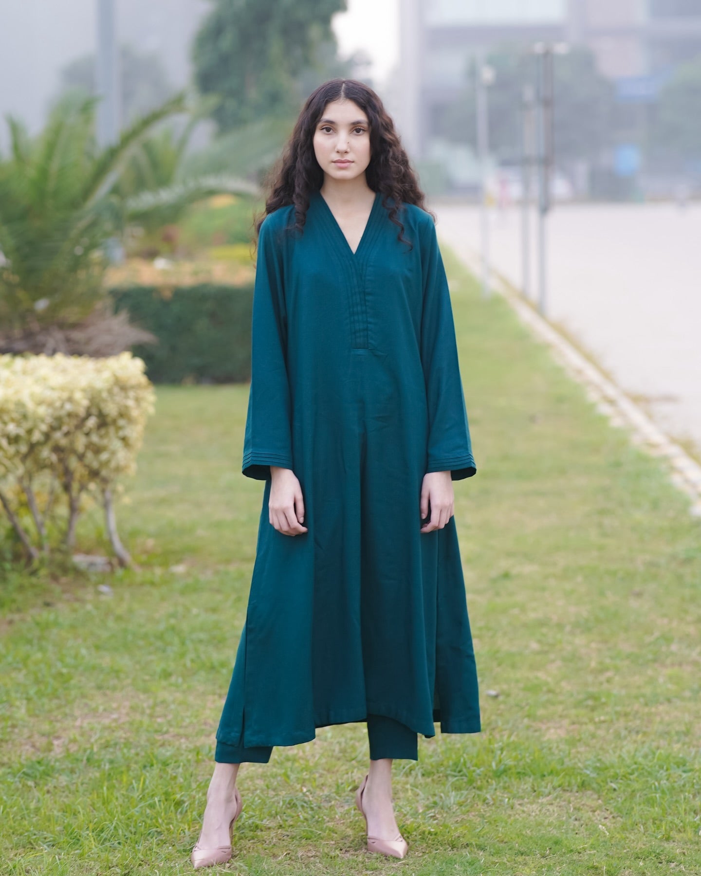 Dive into the world of elegance with our exquisite solid forest green long kameez and trouser ensemble. The lush green hue, reminiscent of a pristine forest, wraps you in a tapestry of sophistication. The long kameez flows with a captivating grace, while the matching trouser adds a touch of contemporary allure. Wear this ensemble and let the rich green become your statement of style, capturing attention with its irresistible charm.