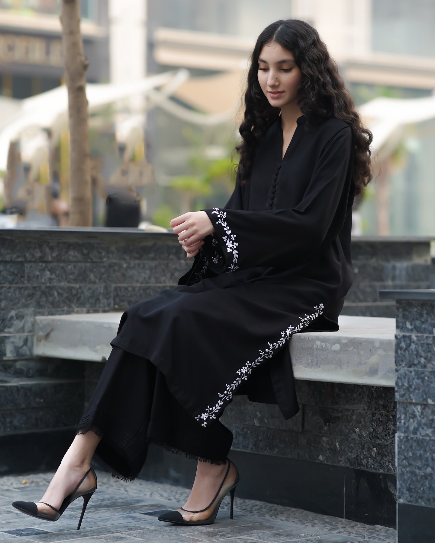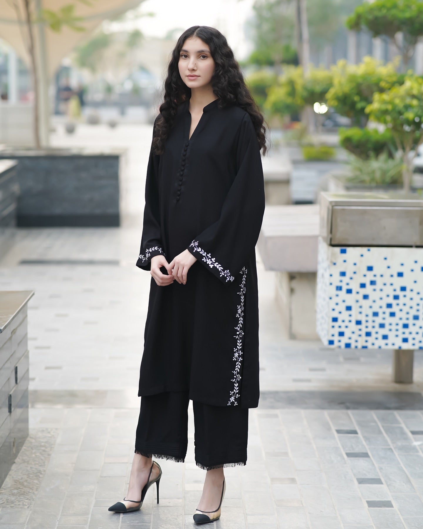 Timeless elegance of this living black kameez and trouser ensemble, where sophistication meets simplicity. The rich ebony hue gracefully drapes the figure. Minimalist white embroidery delicately traces a path along the edges, adding a touch of refinement that whispers rather than shouts. Embrace the understated charm of this ensemble – a testament to the beauty found in subtlety.